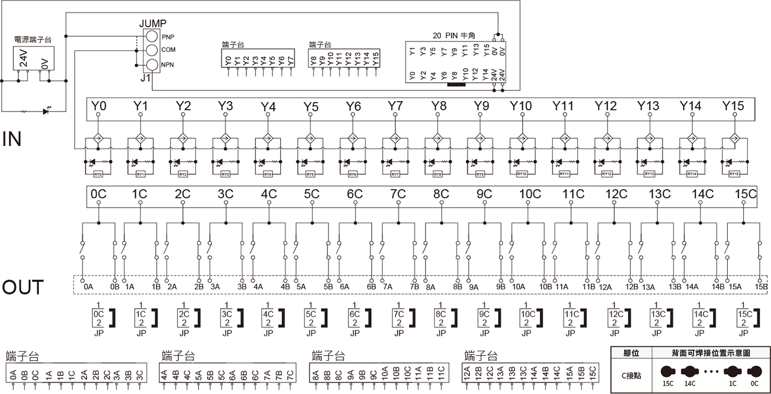 - 内建跨接元件接點保護裝置,使用短路條可簡化線圈端的跨接配線